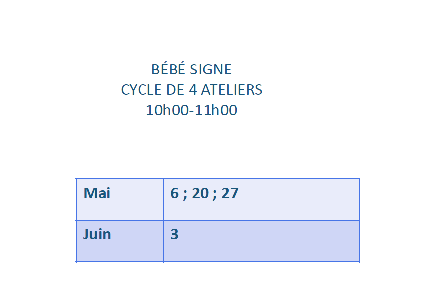 L’enfant est un être naturellement gestuel. Il vient au monde en s’exprimant par son corps. Il ne parle pas encore mais il a beaucoup à nous dire. Dans l’atelier « Des signes pour se dire … » vous découvrirez un outil de communication au service de la relation enfants parents. Vous apprendrez des signes issus de la LSF (Langue des Signes Française) en compagnie de votre enfant, en chantant et vous amusant.